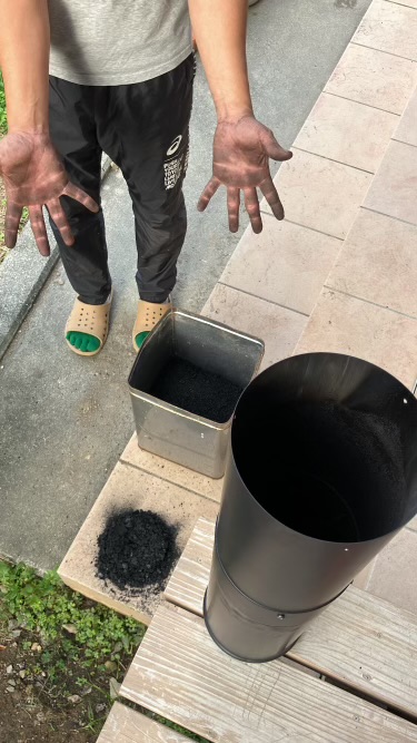 煙突のすすは乾燥があまい薪を焚べると多く付きます。去年はそこそこ乾燥させたつもりだったのですがそれでもこんなに出ました。