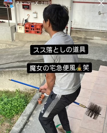 今までは屋根に登って上から細い竹を突っ込んでやっていたのですが、今回は専用の掃除道具を借りることができ、したから掃除してみました。