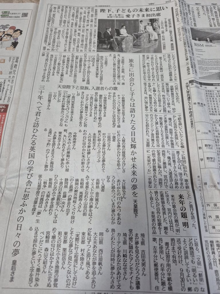 スタッフブログblog 2025.01/24 「夢」 スタッフブログ 昨日、「歌会始の儀」の記事を新聞で見ました。 新春恒例の皇居で催される短歌の会です。 今年のお題は「夢」 「5・7・5・7・7」の限られた字数の中にこめられれた、様々な情景や思いが伝わってきて、感動しました!! 「さあ夢を語りませうと海見ゆる席に「予約」のプレート置かる」 (栗木京子さん) 海の見える席はありませんが、 マイホームの夢をお聞かせください。 3つのモデルハウスで専門のスタッフが お待ちしております。 一覧へ戻る