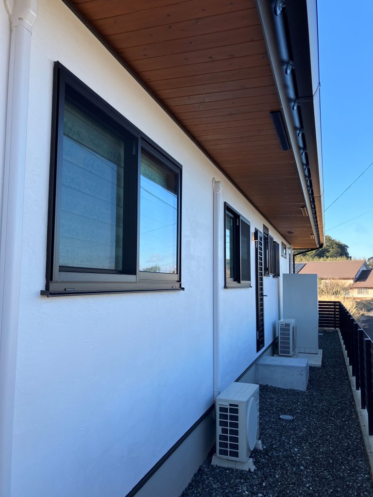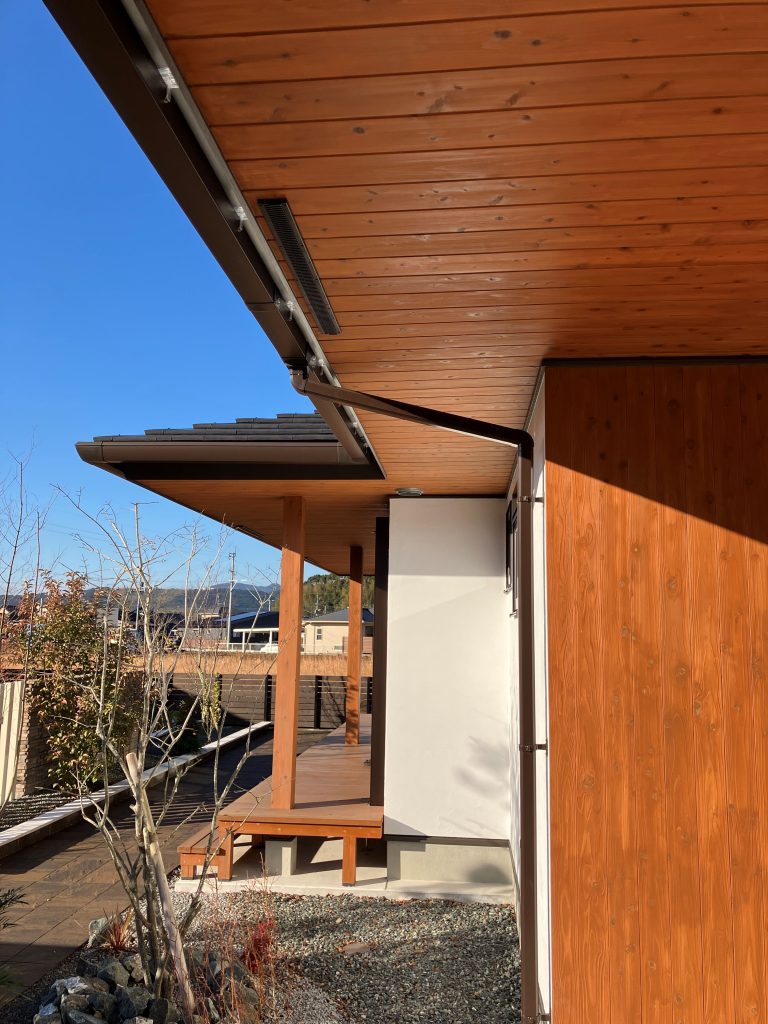 薩摩川内モデルハウスでは画像のように外壁から約80cm先まで雨樋が出ています。