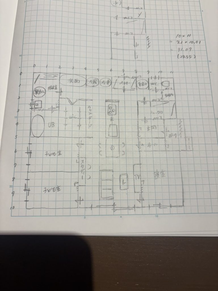 少し見えづらいですが、間取りの作成はこのような手書きでの図面作成から始まります。