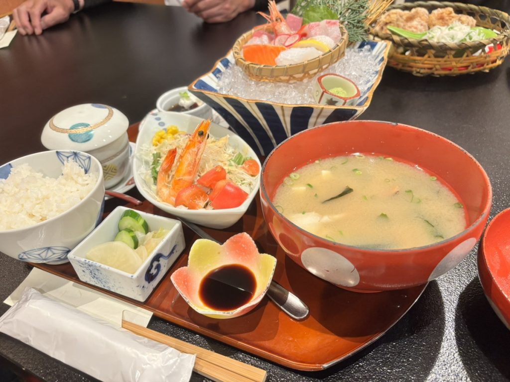 祖父母はお刺身とカニの味噌汁のランチメニュー。