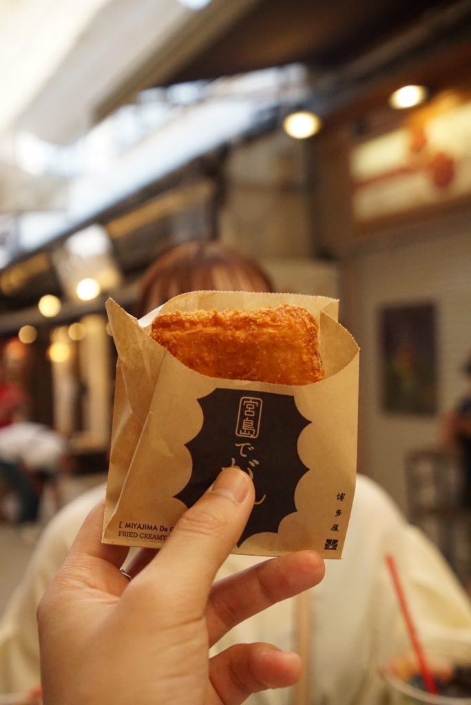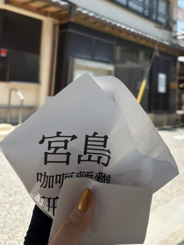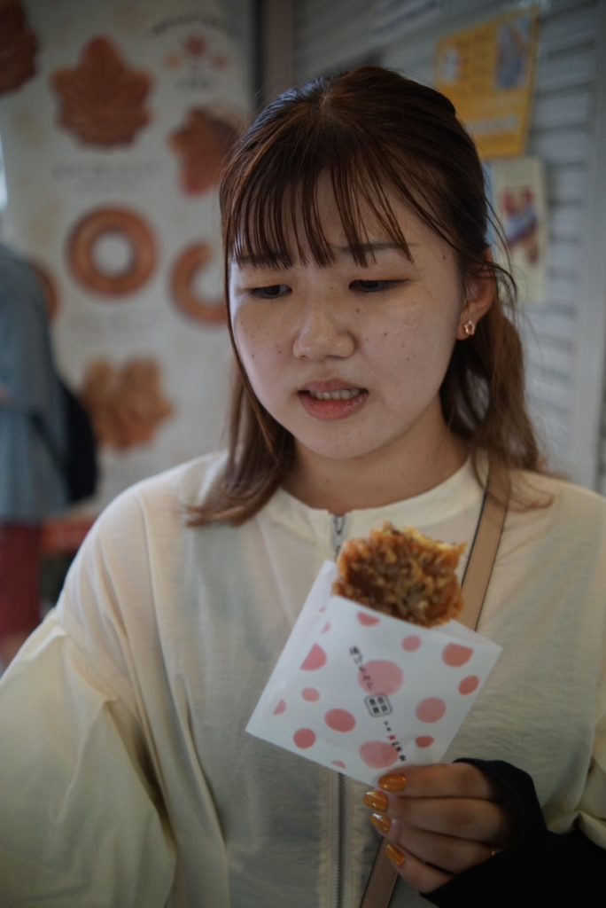 (↑揚げもみじ饅頭とすずめにもみじ饅頭を狙われて不機嫌な西森)