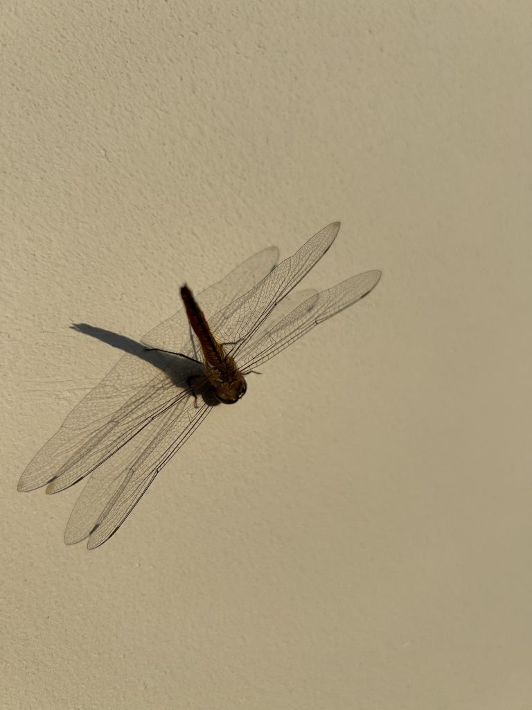 とある日早朝6時半ごろ現場に行ってみたら、外壁漆喰の外壁にトンボが留まっていました。