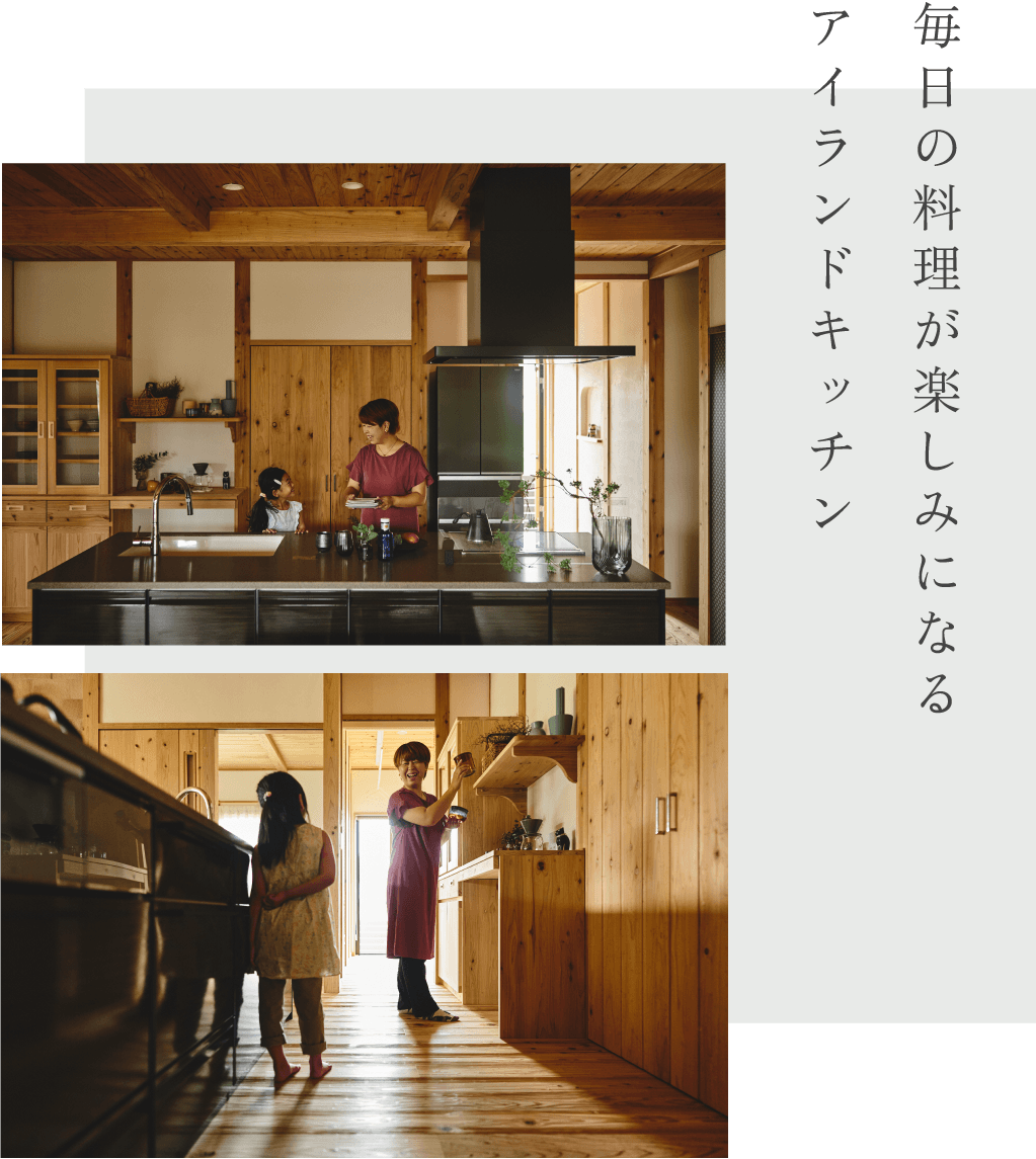 料理好きな奥様のために、開放的で使いやすく、家族とのコミュニケーションもとりやすいアイランドキッチンを採用。