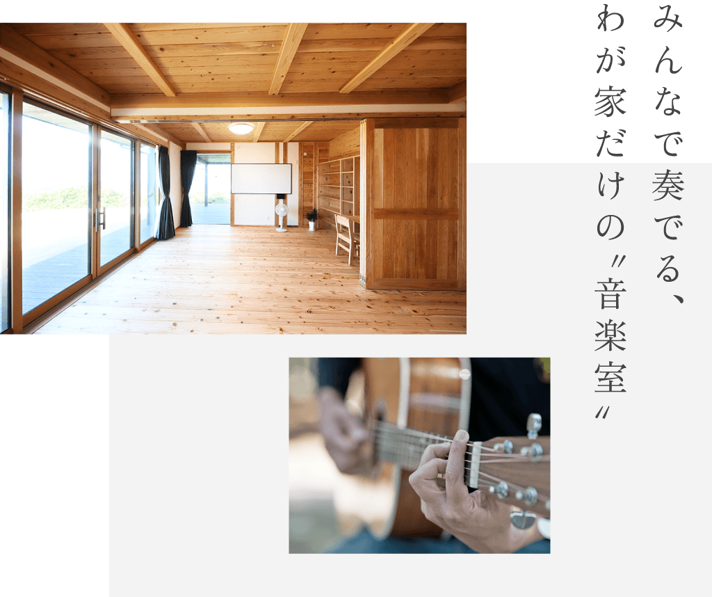 音楽が共通の趣味というご夫婦が、「いつでも音楽を楽しめる場所がほしい」とつくったのは、家族や仲間と一緒に演奏できる空間です。