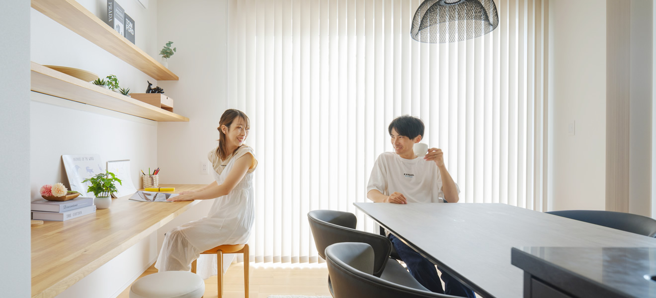 家事の動線を計算し、家族のゆとり時間を生み出すプランニングで、家族がともに過ごす時間、一人ひとりが自由に過ごす時間、どの瞬間もゆったりと、心も身体も安らぐことのできる、癒される空間を創造する住まいです。