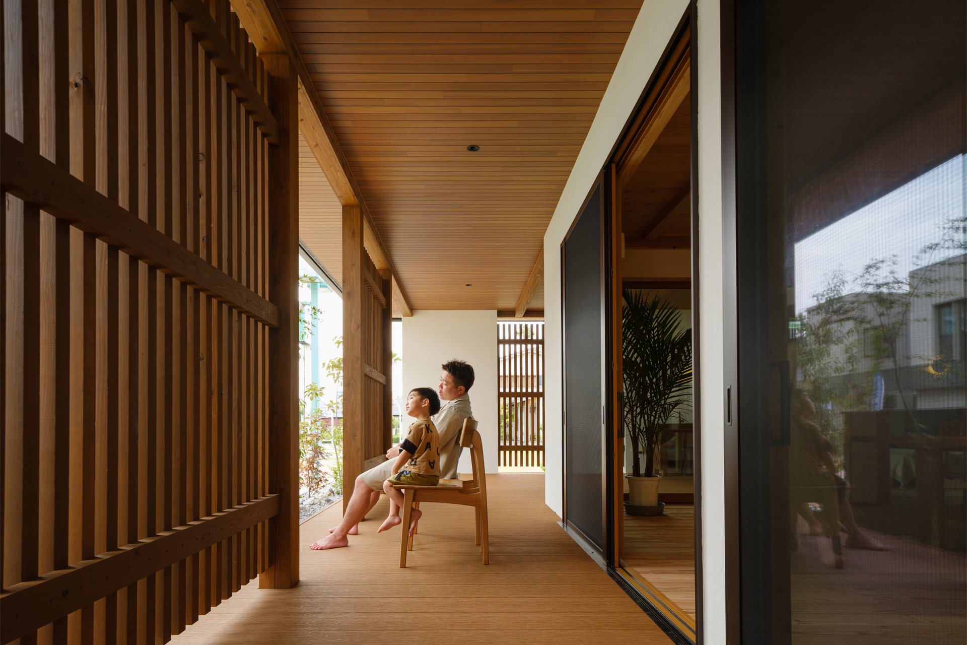 ウッドデッキと深い軒が屋内外をやさしくつなぎ、夏の強い日差しを遮りながら自然な風通しを確保。