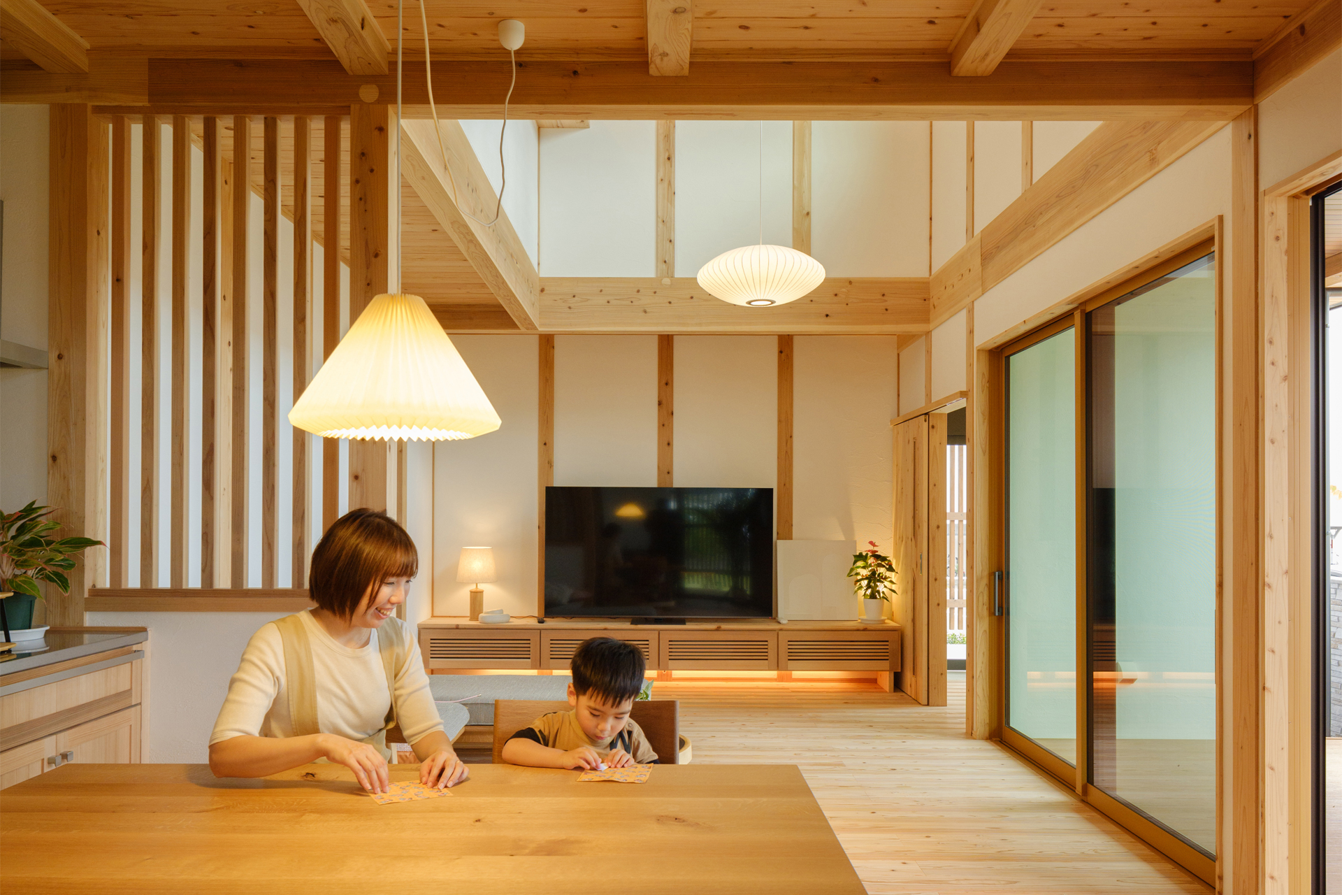格子戸風のアクセントや深い軒、縁側を思わせる設計など、日本の伝統建築の美しさを随所に取り入れつつ、現代的なシンプルさや機能性も両立。