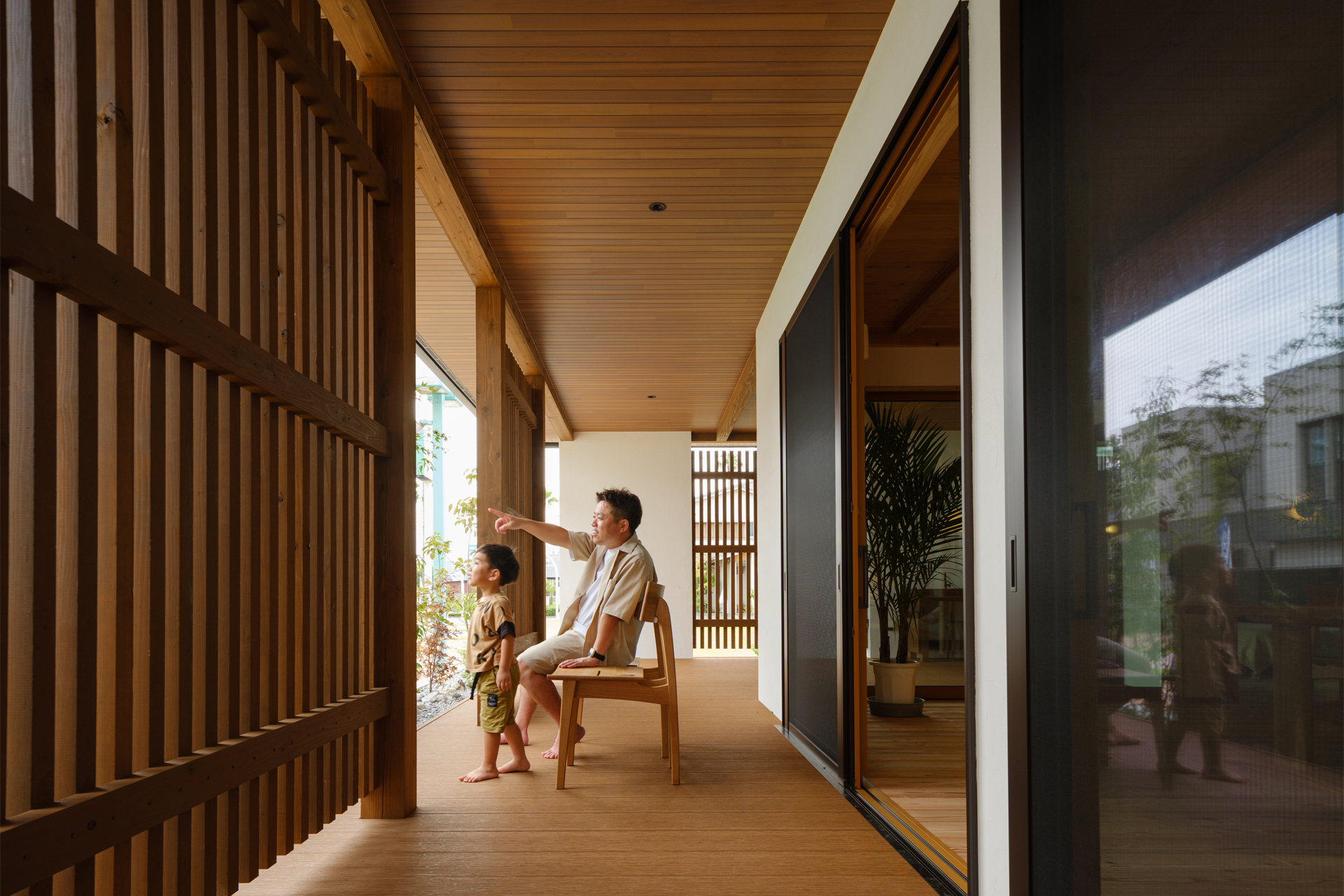 ウッドデッキと深い軒が屋内外をやさしくつなぎ、夏の強い日差しを遮りながら自然な風通しを確保。