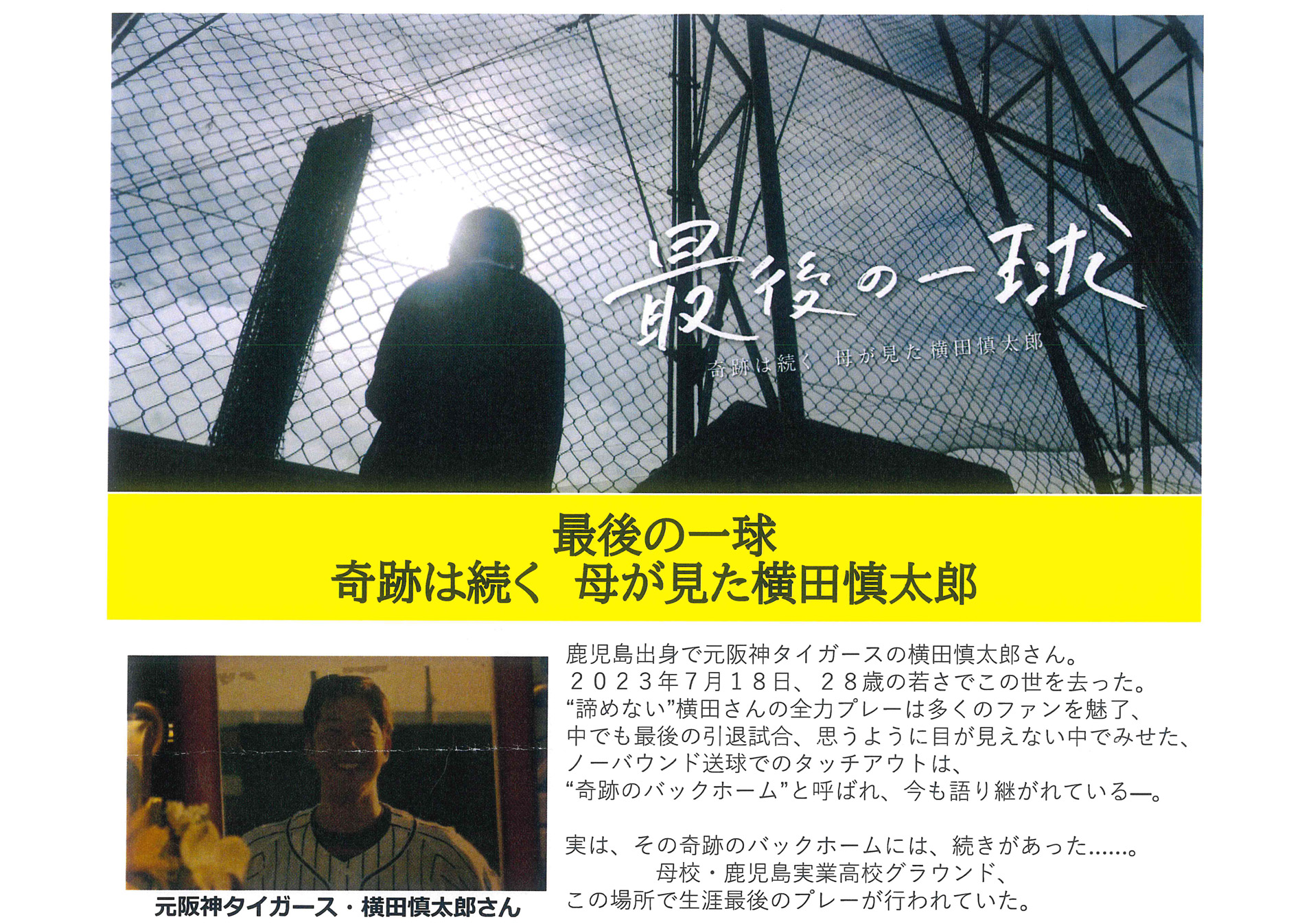 元阪神タイガース横田選手の番組案内「最後の一球 奇跡は続く、母が見た横田慎太郎」