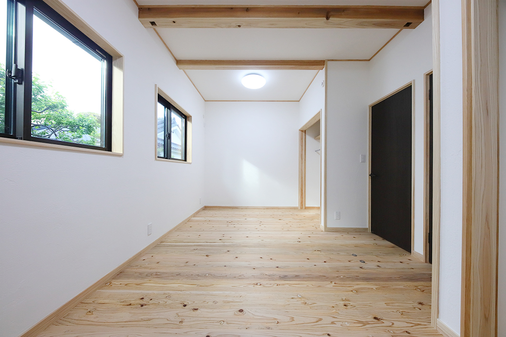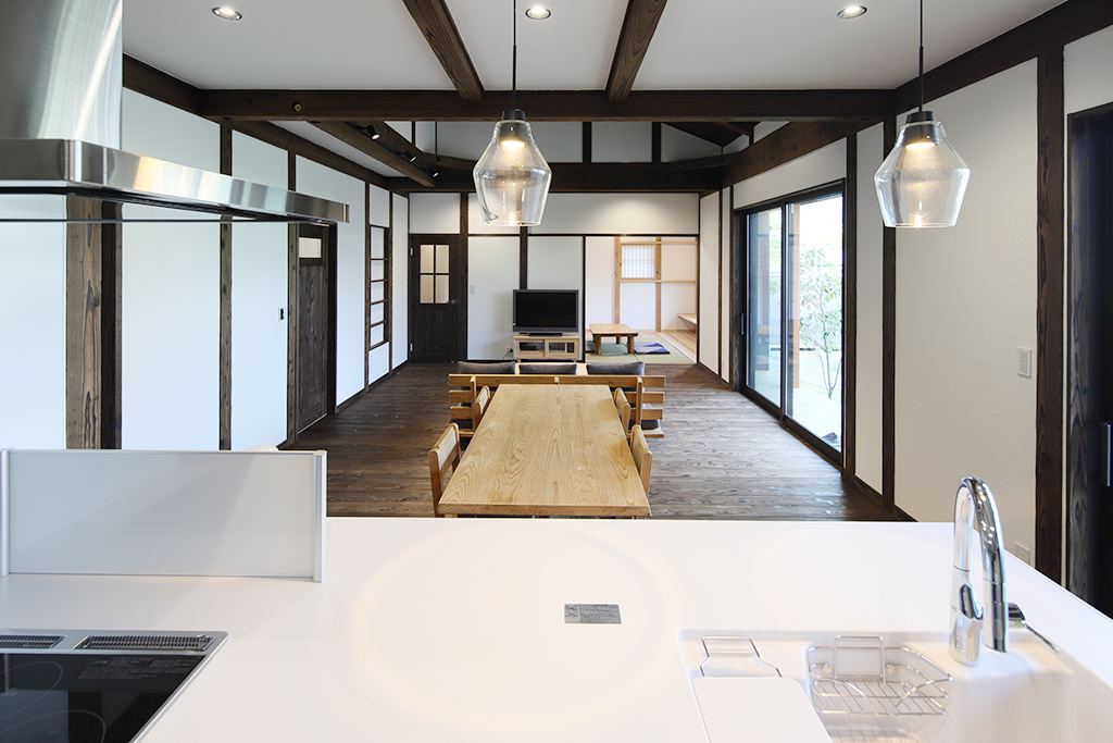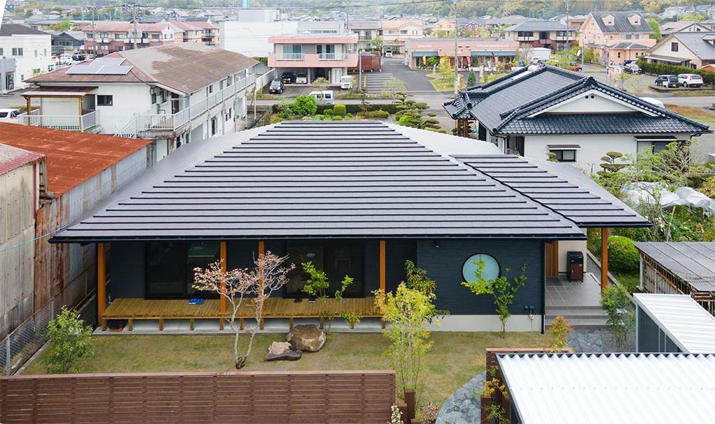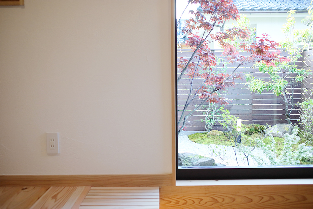 works木々を愉しむ家 #アイランドキッチン#勾配天井#和室#平屋 所在地薩摩川内市 家族構成ご夫婦+お子様1人 延床面積123.59m² 間取り4LDK 木々を愉しむ家 秋には紅葉も 和室から外を望む アイランドキッチンからの焼杉と漆喰 寝室はナチュラルに 玄関からは坪庭を
