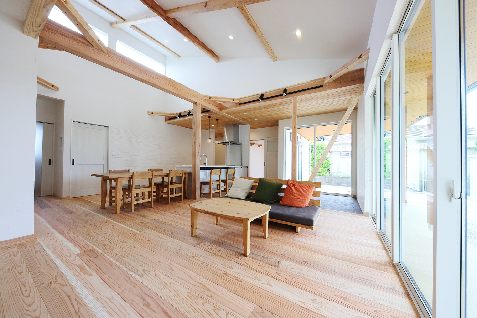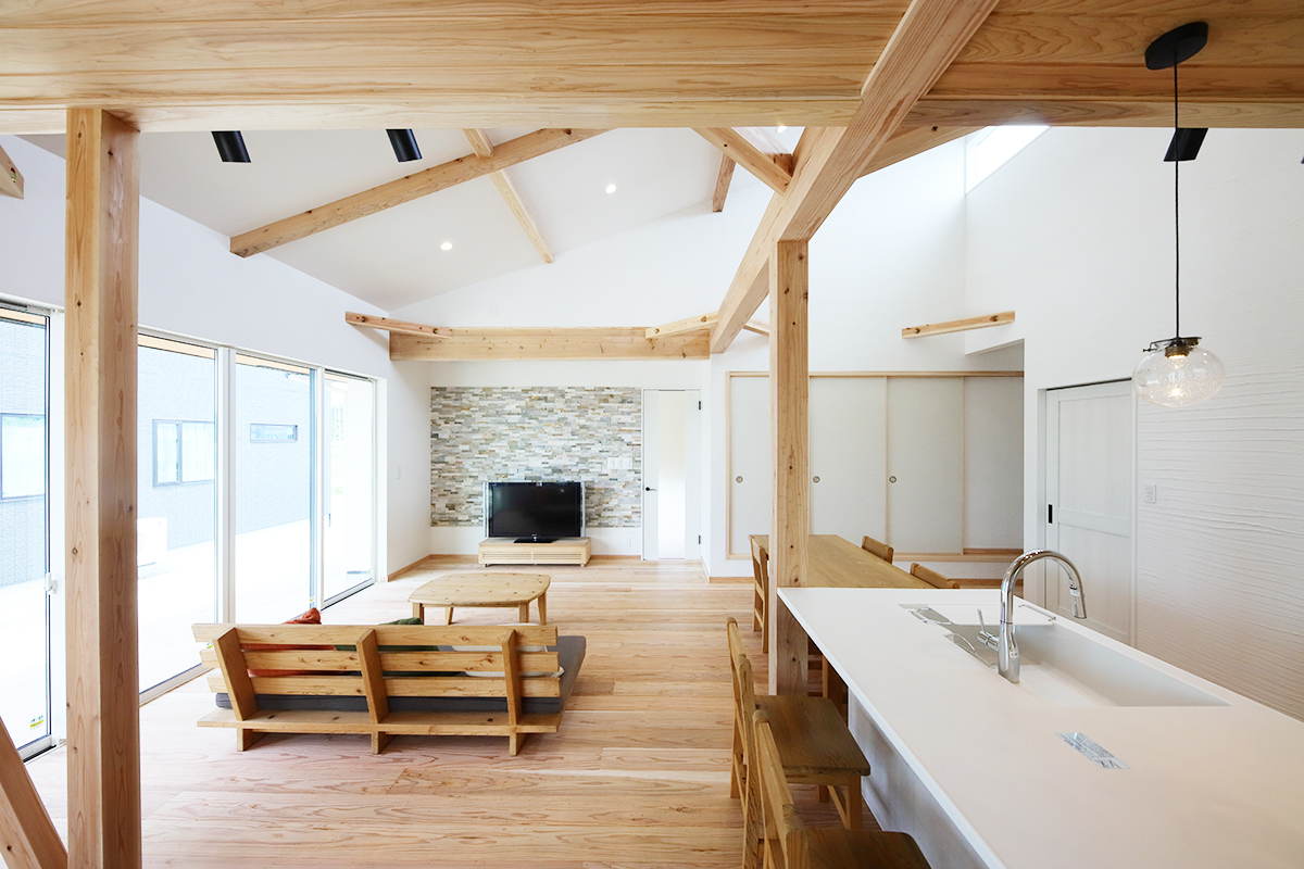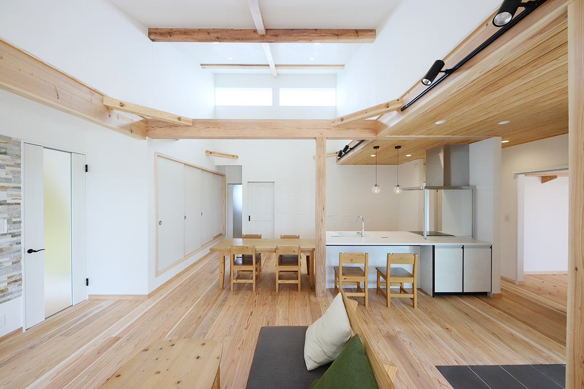 大空間リビングとスキップフロアのある家