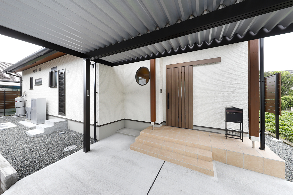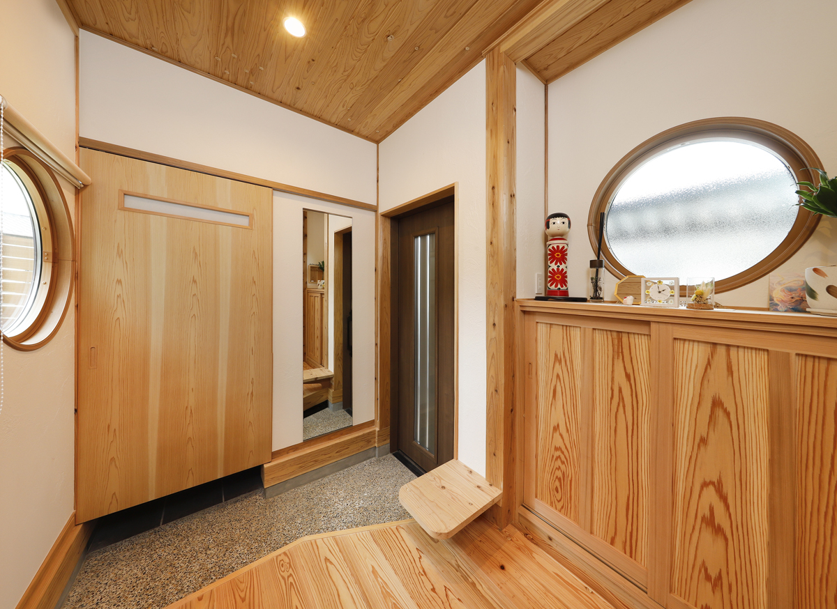 丸窓が目を引く玄関。引き戸の奥は使い勝手のいい土間収納。