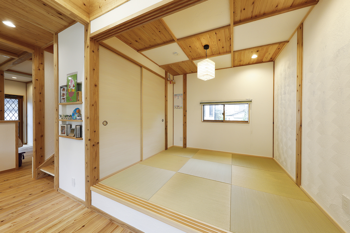 扇仕上げの塗り壁、天井の漆喰と天然木板のコントラストが美しい。