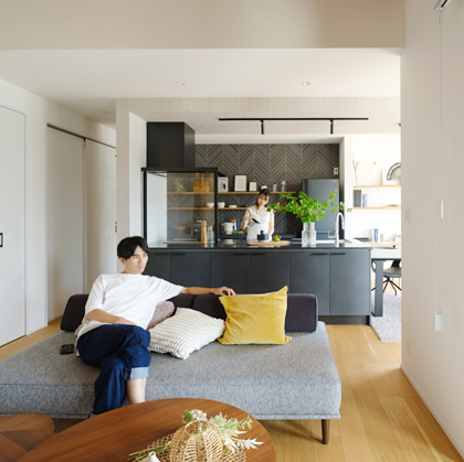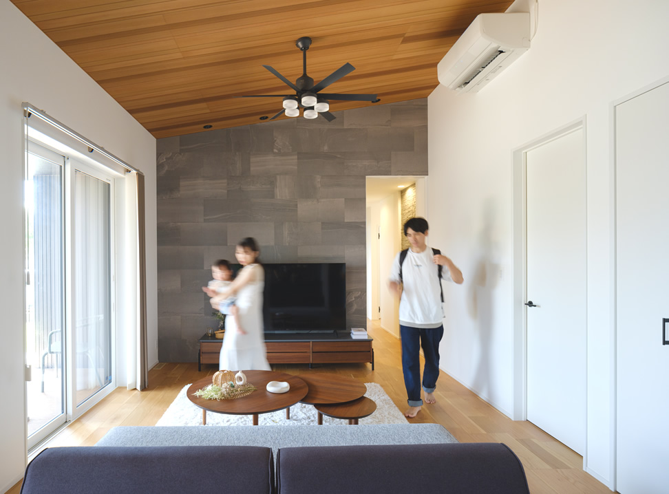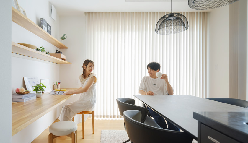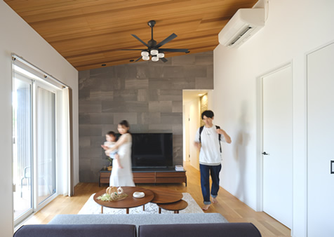 家事の動線を計算し、家族のゆとり時間を生み出すプランニングで、家族がともに過ごす時間、一人ひとりが自由に過ごす時間、どの瞬間もゆったりと、心も身体も安らぐことのできる、癒される空間を創造する住まいです。