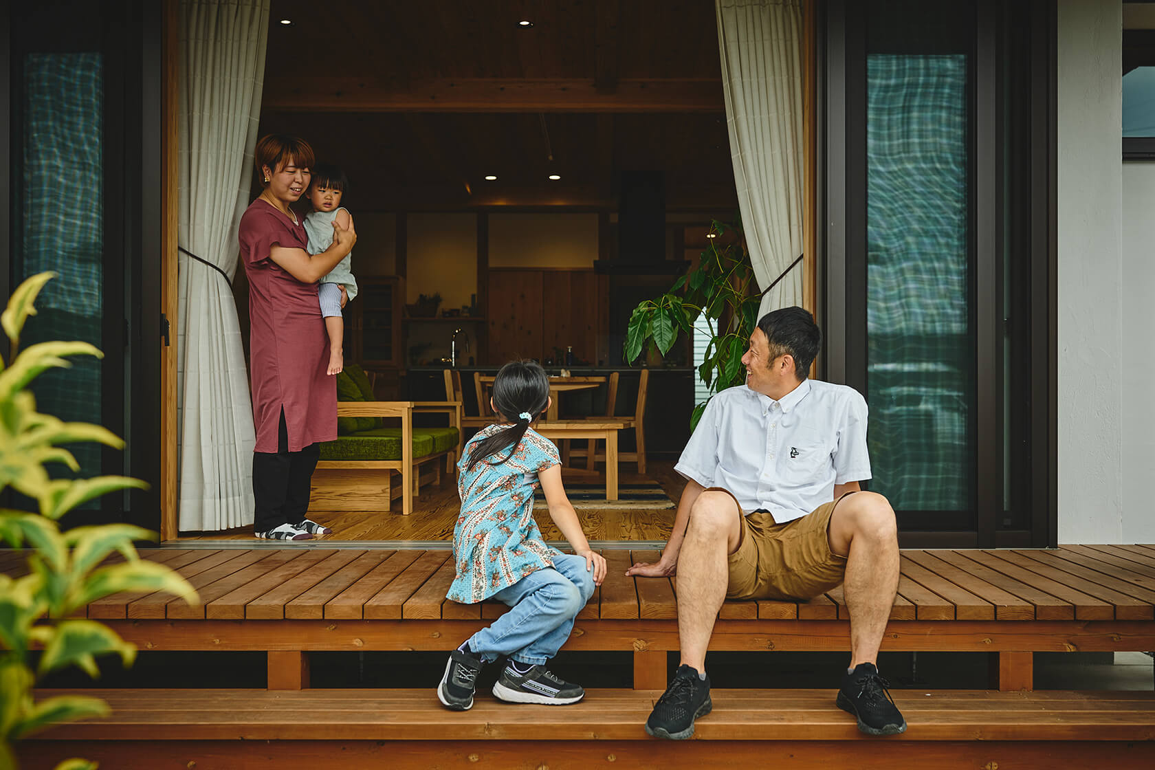 ウッドデッキと室内が、ゆるやかにつながり、自然と調和する安らぎの時間が流れます。